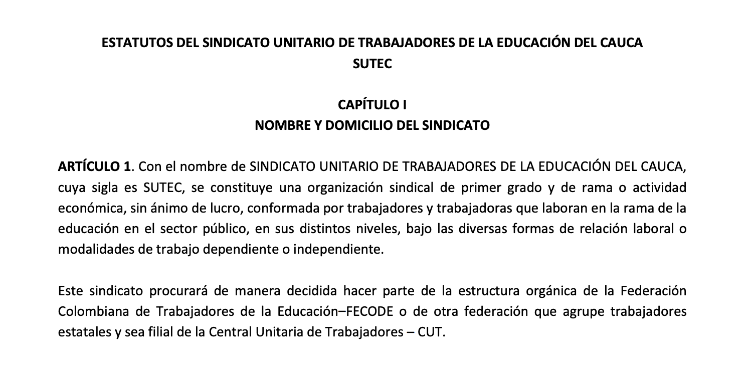 Estatutos del sindicato Unitario de Trabajadores de la Educación del Cauca SUTEC….